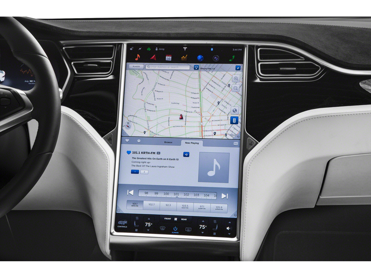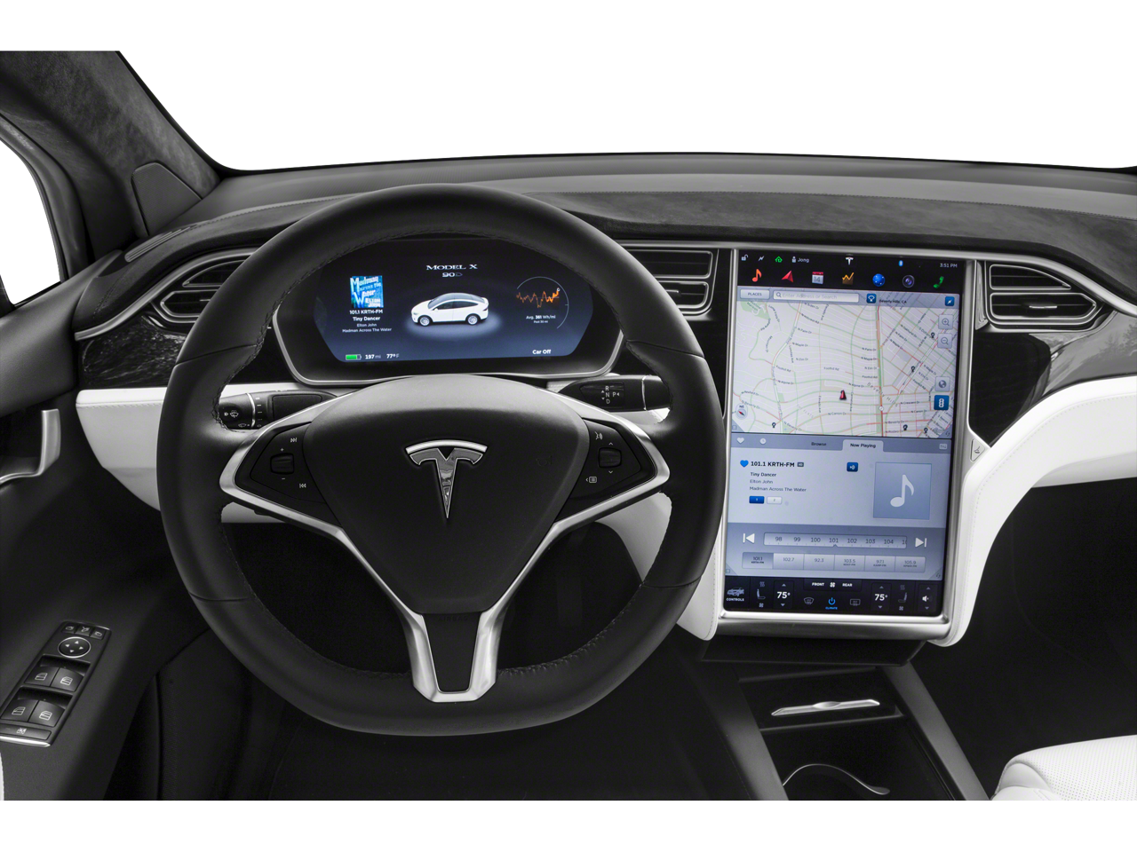 • Radio: FM w/Custom Audio System -inc: 17 speakers w/neodymium magnets, specifically tuned for a Tesla's ultra-quiet cabin, XM satellite radio capability, Bluetooth connectivity w/on-demand and internet radio capability, 2 USB ports for media and power, maps and navigation w/real-time traffic-based routing, Bluetooth hands-free calling and media streaming